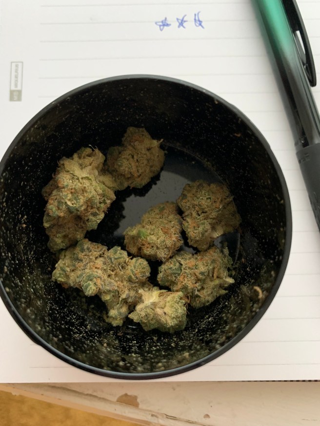 Maybe it’s the weed or just the fact that I’m high and not inclined to do much. I’ve got no project going, I’m not leaving for anywhere soon. I’ve got the writer’s pen flowing, so I must tip my hat to this Peking Duck. It was ten months on the shelf and that had my expectations set pretty low. But it has given me a pleasant, straightforward, not-too-achy, functional buzz. I’m mellowed out but still looking for little things to do. Sweeping the garage, taking the dog for a walk, eating a bit of food. Writing. Typing, blogging, doing this strain review.