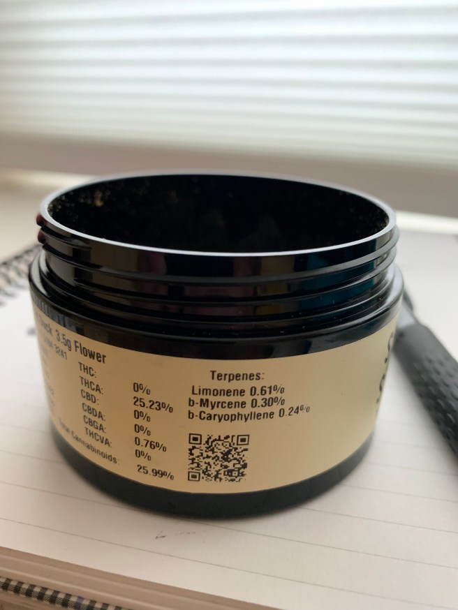 Total of 1.15%. I’m still feeling my way with terps. How much is a lot? What’s not enough? I read a review of a strain recently where .91% terps were panned as being too little, too low. Of the three eighths I bought, this was the lowest terp total. Limonene .61%, b-Myrcene .3%, b-Caryophellene .24%.