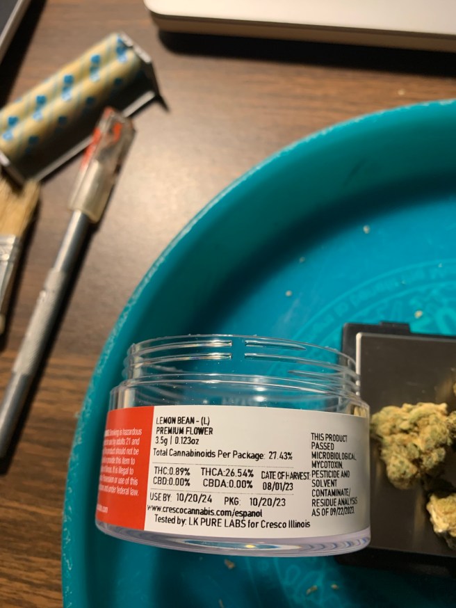 That orange rubber taste, orange-flavored pencil eraser. It’s an eighth of Lemon Bean from Cresco Labs, purchased in the area known as the Metro East, aka Illinois on the other side of the Mississippi River from St. Louis.