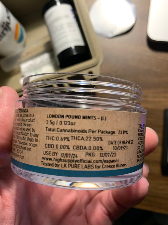 This flower was grown by Cresco Labs. Then marketed under their High Supply label, which is a discount brand. I bought it at a Beyond/Hello in Sauget, Illinois. I have picked up a few High Supply canisters over the last year. Slurricrasher was the most recent. Before that, I bought a quarter of Kush Mints under the High Supply label. The Kush Mints was not memorable. It was fine. The High Supply Slurricrasher was good, not great. Not as good as the Slurricrasher I bought under the Cresco label. This London Pound Mints seems to be my favorite so far out of three High Supply buys.