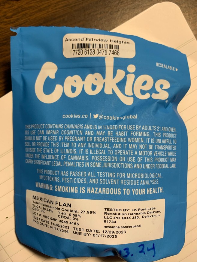I bought a bag of Mexican Flan—also sold under the Cookies brand—in Ruidoso, New Mexico at some point in 2023 or early 2024. It wasn’t anything special. But I chalk that up to the New Mexico market being uneven. Whoever was growing Cookies strains in New Mexico would not be the same entity growing Cookies in Illinois. I understand that it’s Revolution growing Cookies strains in Illinois. This review is about the bag I bought in Illinois.