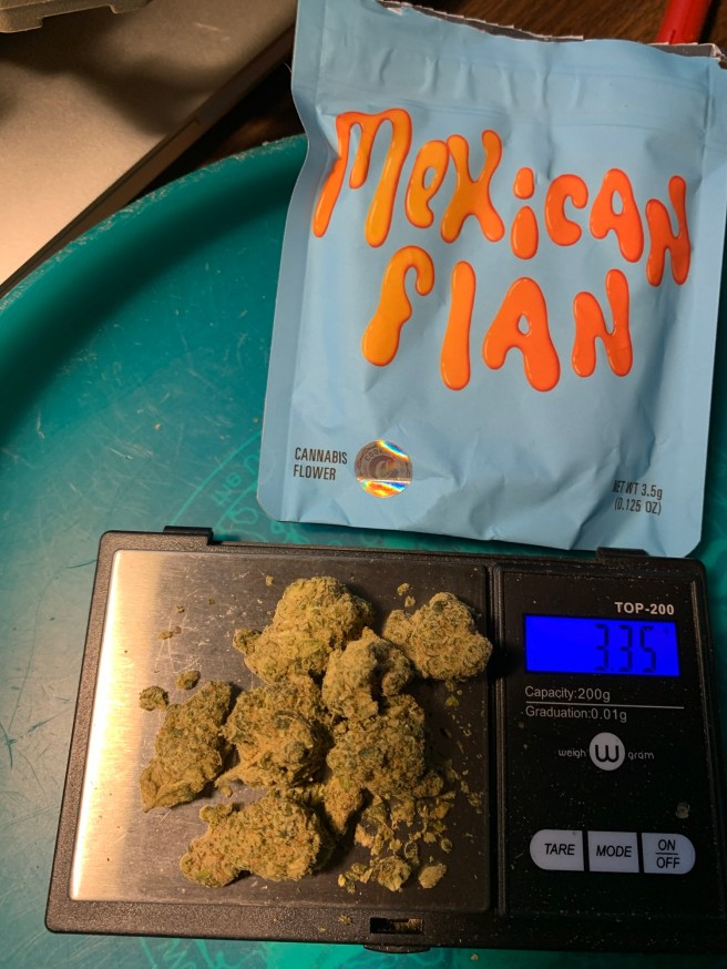 This will not be my first time trying the strain known as Mexican Flan, which is a cross between Ice Cream Cake and Animal Mints. Those are a couple of strains I have had “on their own.” And I like both of them. Ice Cream Cake has been a pleasant, chill indica vibe while Animal Mints has some muscle to it.