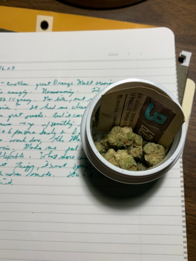 Any time a smoke has me putting pen to paper, the flower has passed my effects test. The high has me feeling peripatetic, willing to wander. It led me to ponder, but not in a heavy way. Aside from strains that just did not do it for me, this was some of the least bitey weed I have had in the last few months. I get high without being dragged down into the deliberative dungeon. I get a buzz without getting paranoid. This seems to be the goal.