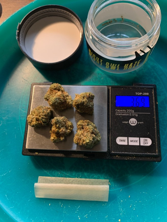 There are 3.69 grams of bud in the jar, a generous portion. This strain called Night Owl Haze smells good. It has that citrus tang and aromas of pine. The bud has a rocky feel. It’s long in the tooth. The jar has a package date of 3.6.2024. It is March 18, 2025 as I write. Although the jar carried an inner wafer-style seal, I sense that the seal might have come loose at some point, and this bud has dried out. Nonetheless, I will forge ahead and roll some of it up anyway. It’s not the bud’s fault I let it sit so long.