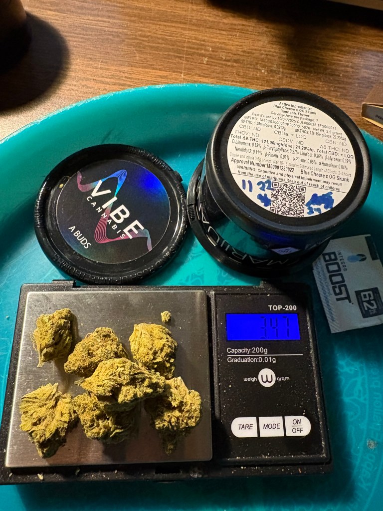 This is the Blue Cheese. Another mind-activating, mind-bending sativa from Vibe Cannabis. I’d get this again, it gets me as close to happy, as close to contentment as I will get until I drop my unreasonable expectations for this life. 11:03.