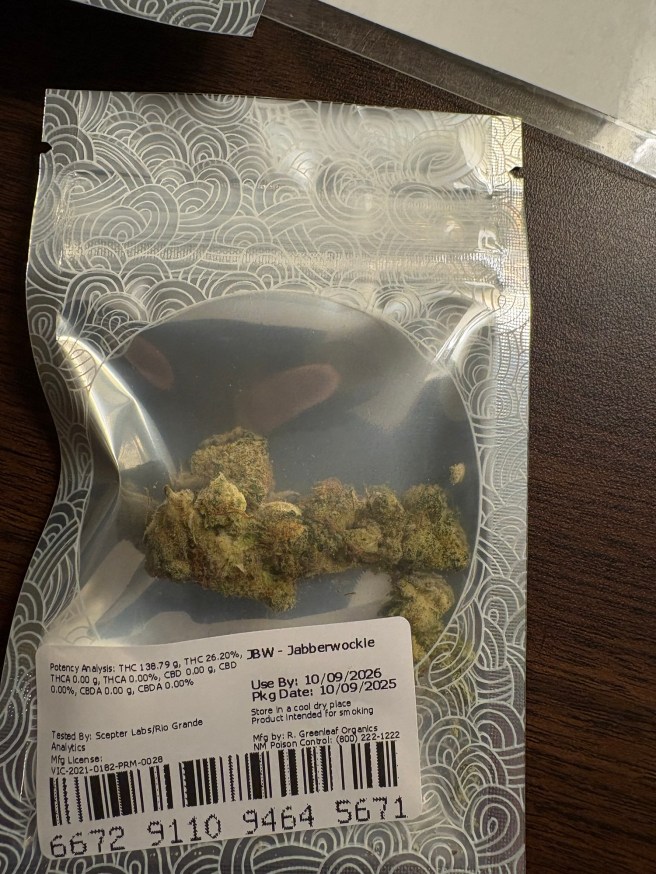 Like this Jabberwocky, which right now is acing the pen-to-paper test, which could be its own tag except that any strain I end up reviewing by way of this blog must have passed the pen-to-paper test so it would be redundant to mention that in the review. Some strains might deliver effects typical of indica flower, meaning I might not be alert or motivated enough to write anything about them. So my reviews are probably biased toward sativas!
