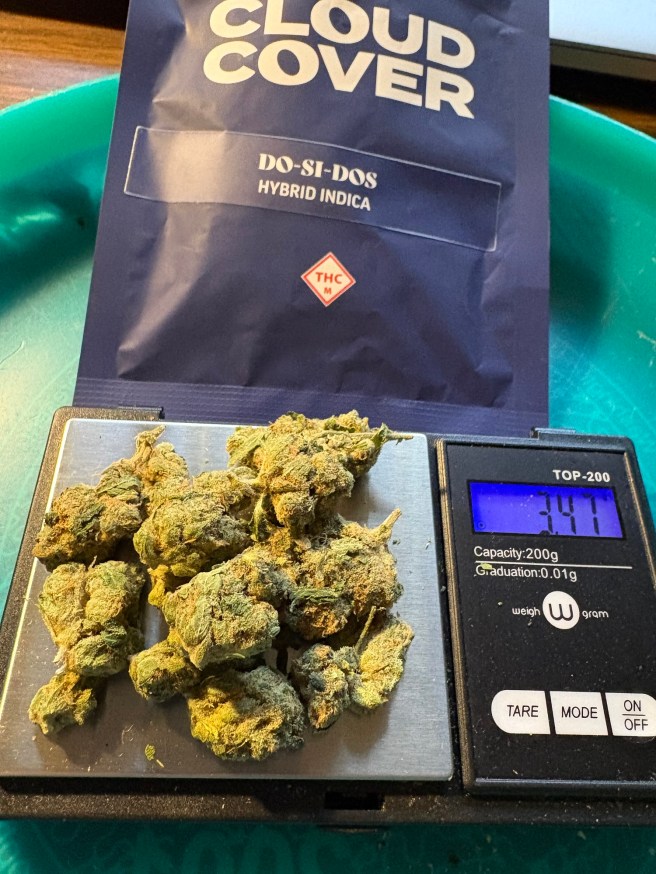 The lineage on Do-Si-Dos is OGKB x Face/Off OG BX1. (Source: Seedfinder, link here.) OGKB is a cut or specific phenotype of GSC (which used to be called Girl Scout Cookies , a name that is no longer used for obvious reasons). Some descriptions say that OGKB stands for OG Kush Breath. Is OG Kush Breath its own strain or simply a GSC cut? I am a little unclear on that (link here for that version of the story). I like to think OGKB stands for “Original Kind Bud”. Back in 2000, that’s what people used to call the visually appealing, non-compressed cannabis flower that was starting to become available—in Missouri, anyway. KB, kind bud. Everything else we were smoking back then was so-called “brick weed”. Also known as “Mexican brick”. That’s all there was! It was dry as a bone and smashed down flat so it would take up less space as it was being smuggled in from wherever. We would break it up and then put it in a container with a chunk of apple or a tiny piece of wet sponge. That brick still got me plenty high, though. Twenty-six years later, here I am!