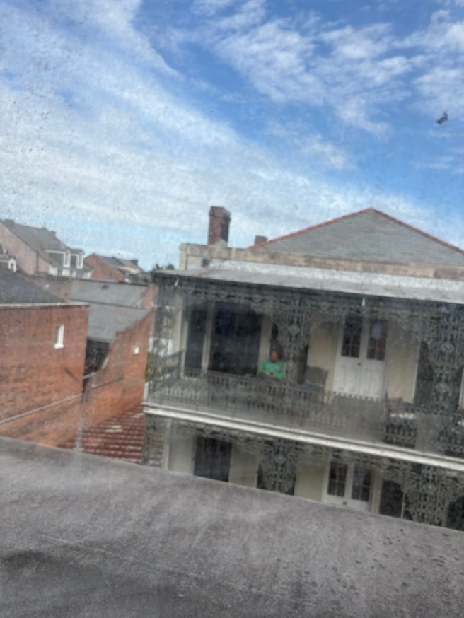 Or maybe I should look at the bright side: I went to New Orleans and came back with a better sense of who I am, and who I am not. I don’t need to go to bars. I don’t need to drink up to keep up. I don’t need to run in a pack. What I needed, then more than ever, was to be like this fella who we could see out of our window. He was sitting on the balcony of a building on the other side of St. Ann in a green hoody that said something like, “Université de Paris.”