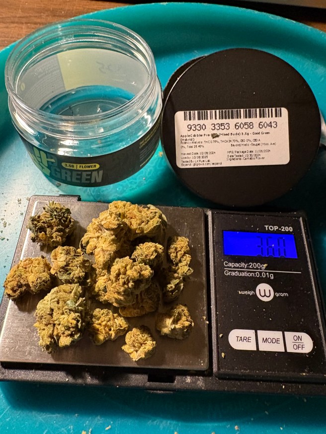 I must say, I don’t see Blue Moonshine listed as a parent of flower strains very often. I see it listed further up many lineages, in Blue Dream, in Skywalker. The Blueberry line shows up a lot. I don’t recall seeing a lot of Sour Apple as a direct parent either. Original Diesel and Cindy 99. Heavy indica lineage on one side (Bluberry) and racy sativa on the other side (Diesel and Cindy 99). Works for me. I gotta say, too. I don’t see sister brand Rythm as prominently on the Sauget, IL menu as I used to. It’s still there but the parent company GTI seems to be offering many more strains, and some classics like Clementine and Sunset Sherbet, through this “Good Green” label. First it was through &Shine but &Shine seems to be quarters and half-ounces mostly. The Good Green jars are plastic and the nugs aren’t as nice as what comes in the Rythm glass eighth jars but I can’t argue with the taste and effects of this Apple Cobbler for $25 an eighth.