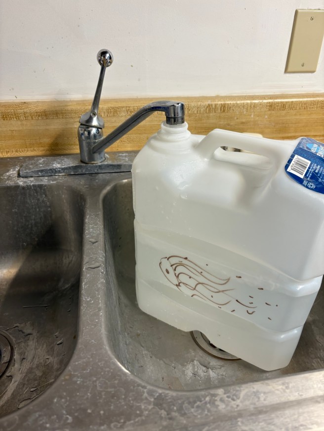 I will fill some empty water containers. Main breaks are a legitimate concern. I’ll also power up a mobile battery pack. I have plenty of AAAs for my headlamp, should it come to that. The rectangular hard-plastic water jugs are excellent for re-use. They are sturdy and durable. I dry them out between uses; travel with them. I put a little bit of rope caulk/putty on the slit you have to make to break the vacuum that would otherwise keep the water from flowing out of the spigot.