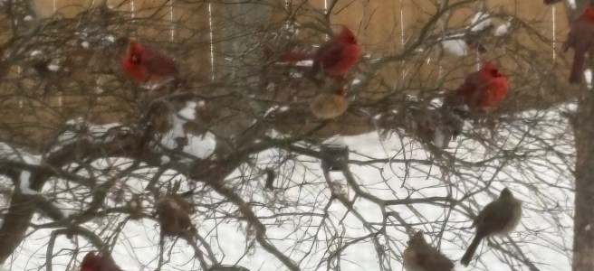 You gotta love a good pen-to-paper strain, which Crazy Hazy so far seems to be. Sip a little vodka soda, brace for the storm. In the backyard is what I believe is a “foraging flock” of a few dozen birds of various species visiting our feeders and water stations. These flocks are led by Black-capped Chickadees but in this case the flock is highlighted by what must be six pairs of Northern Cardinals. The red males are so striking.