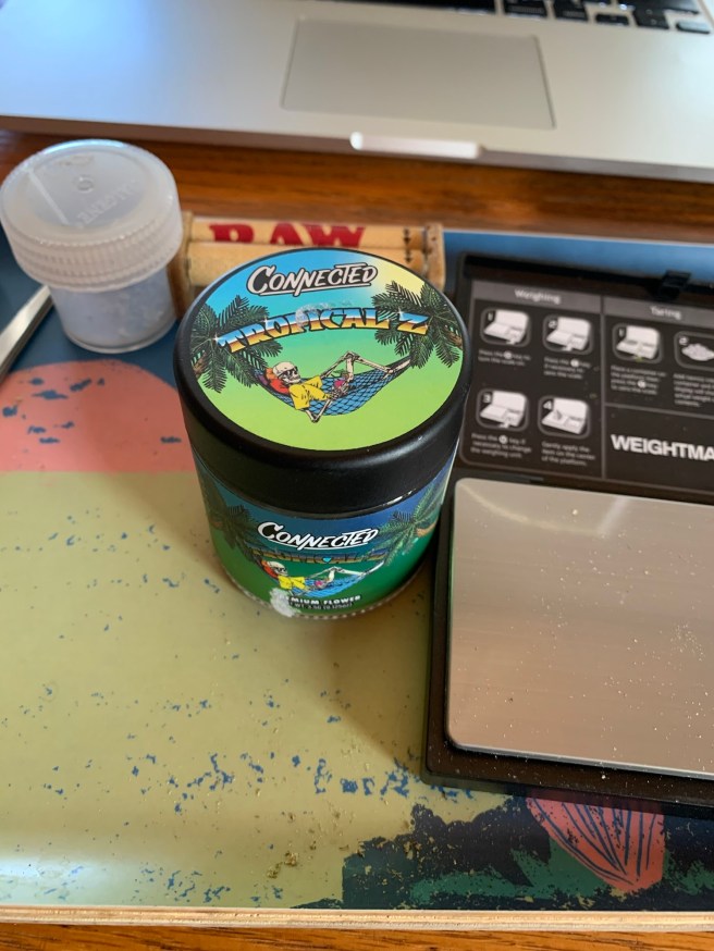 This Trop Z I smoked was pretty old. It’s almost Christmas and I opened this jar here in Tucson/Catalina Foothills back in March! But it was still tasty, with that orange rubber and menthol flavor. Score another win for some of the older flower. I already wrote a review of Tropical Z for this site (link here) but this last bit has kept so well (in the desert) and it still delivers a lift so I’m going to do a curtain call, an encore, a Trop Z Redux.