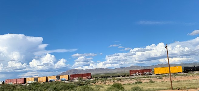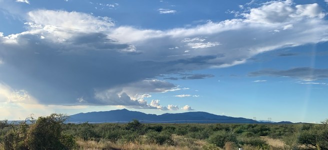 I'm feeling the fuel. There's an energy in my legs. The rush, the bite. San Simon River, dry. Mountains all around. Ranchland, scrub land, desert, speed limit 75. There are snow-capped peaks on some of these mountains, which is not usually the case. The sky is clear but the air is hazy. Two hours to Tucson, 13 miles out of Bowie. Telephone poles, electric lines. Remorse, regret, second thoughts. This is that bite. The weed goes in and starts pulling skeletons out of your closet, if you have them. But it's part of the process, it's part of the high. It can be therapeutic. This is the hard part, you just gotta get through it...